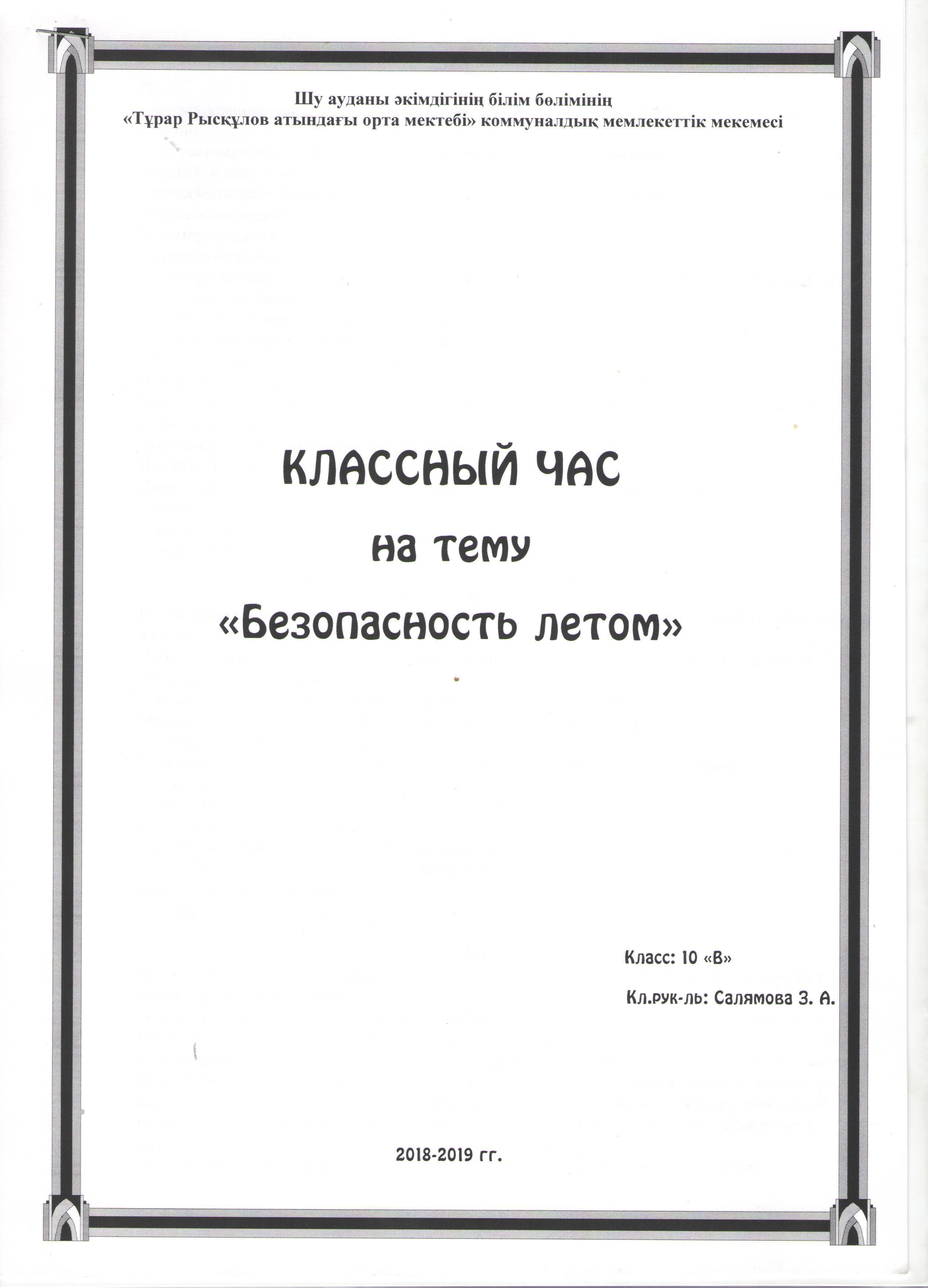 Классный час "Безопасность летом". 10 "Б" класс. Салямова З.А. » Тұрара Рысқұлов атындағы орта мектеп
