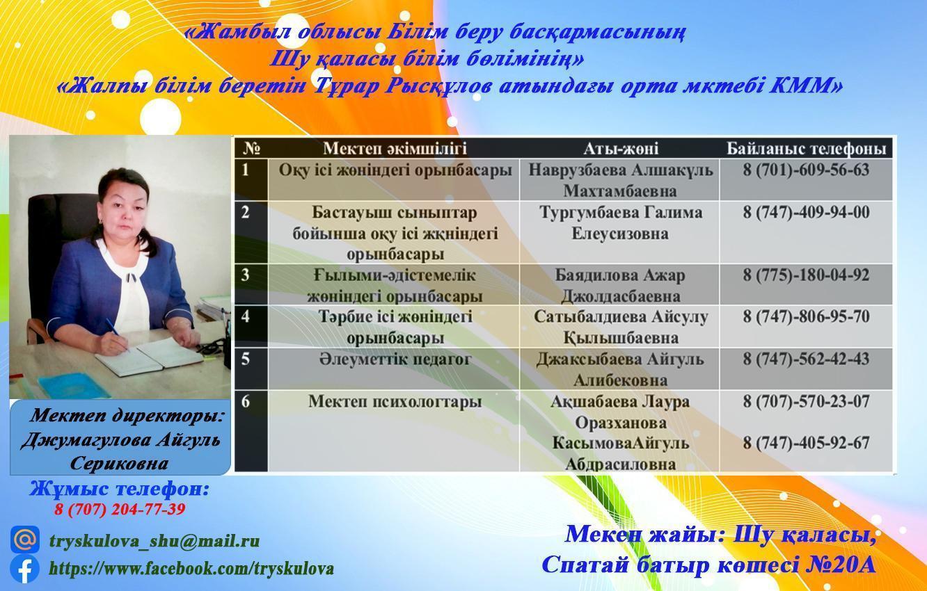 Құрметті ата-аналар! Сізді мазалаған қандайда бір сұрақтар туындаса Тұрар Рысқұлов атындағы орта мектебінде кез келген уақытта жауап беретін әкімшіліктің бар екендігін хабарлаймыз!