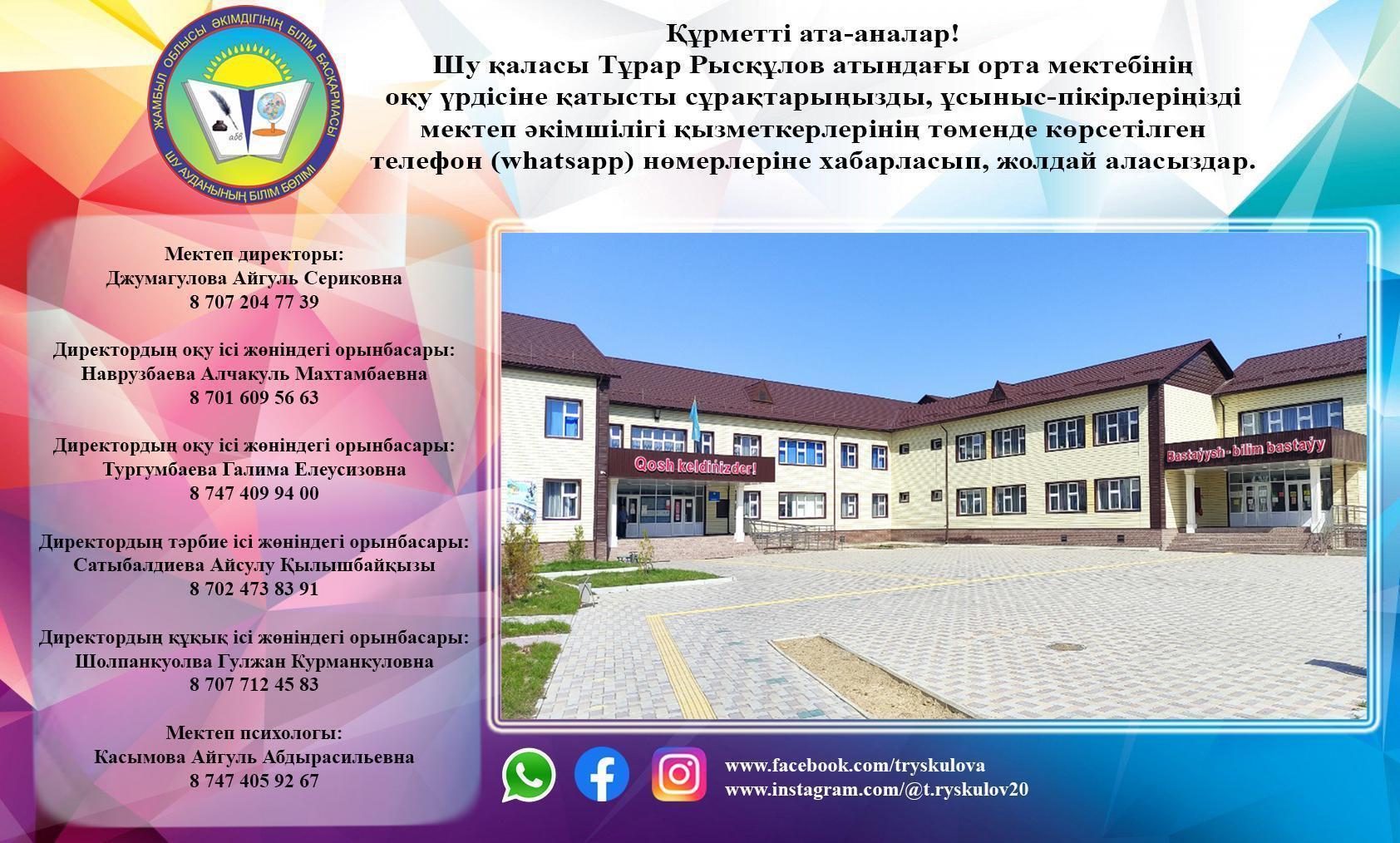 Құрметті ата-аналар! Шу қаласы Тұрар Рысқұлов атындағы орта мектебінің оқу үрдісіне қатысты сұрақтарыңызды, ұсыныс-пікірлеріңізді мектеп әкімшілігі қызметкерлерінің төменде көрсетілген телефон (whatsapp) нөмерлеріне хабарласып, жолдай аласыздар.