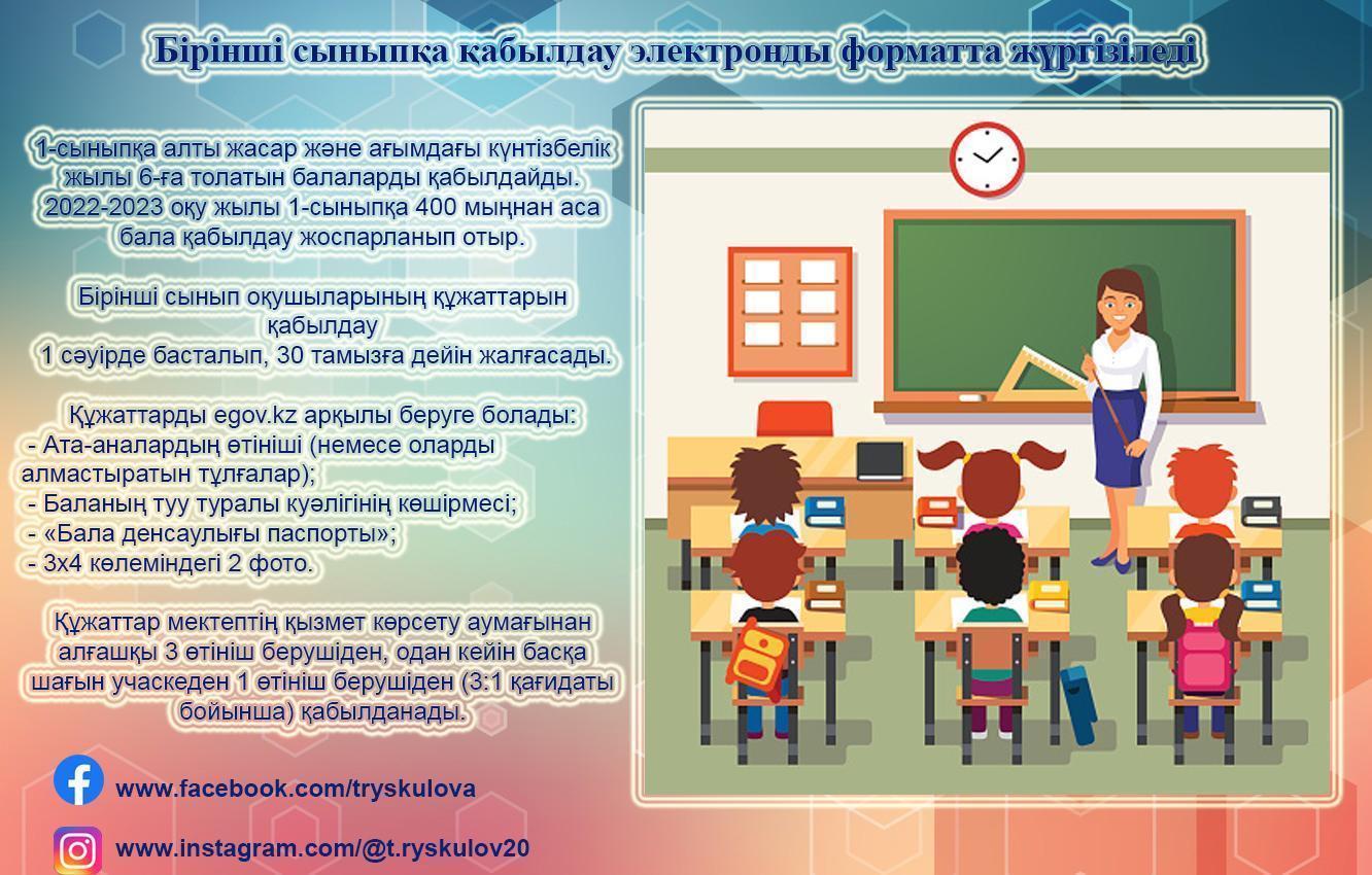 Бірінші сынып оқушыларының құжаттарын қабылдау 1 сәуірде басталып, 30 тамызға дейін жалғасады. Құжаттарды egov.kz арқылы беруге болады: