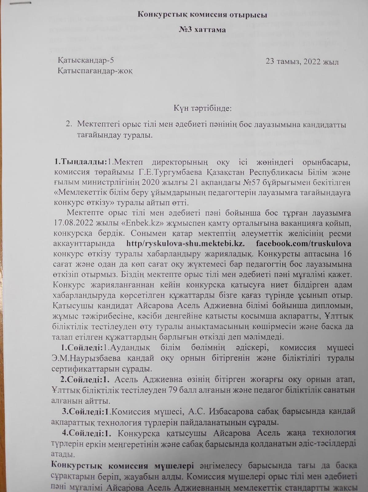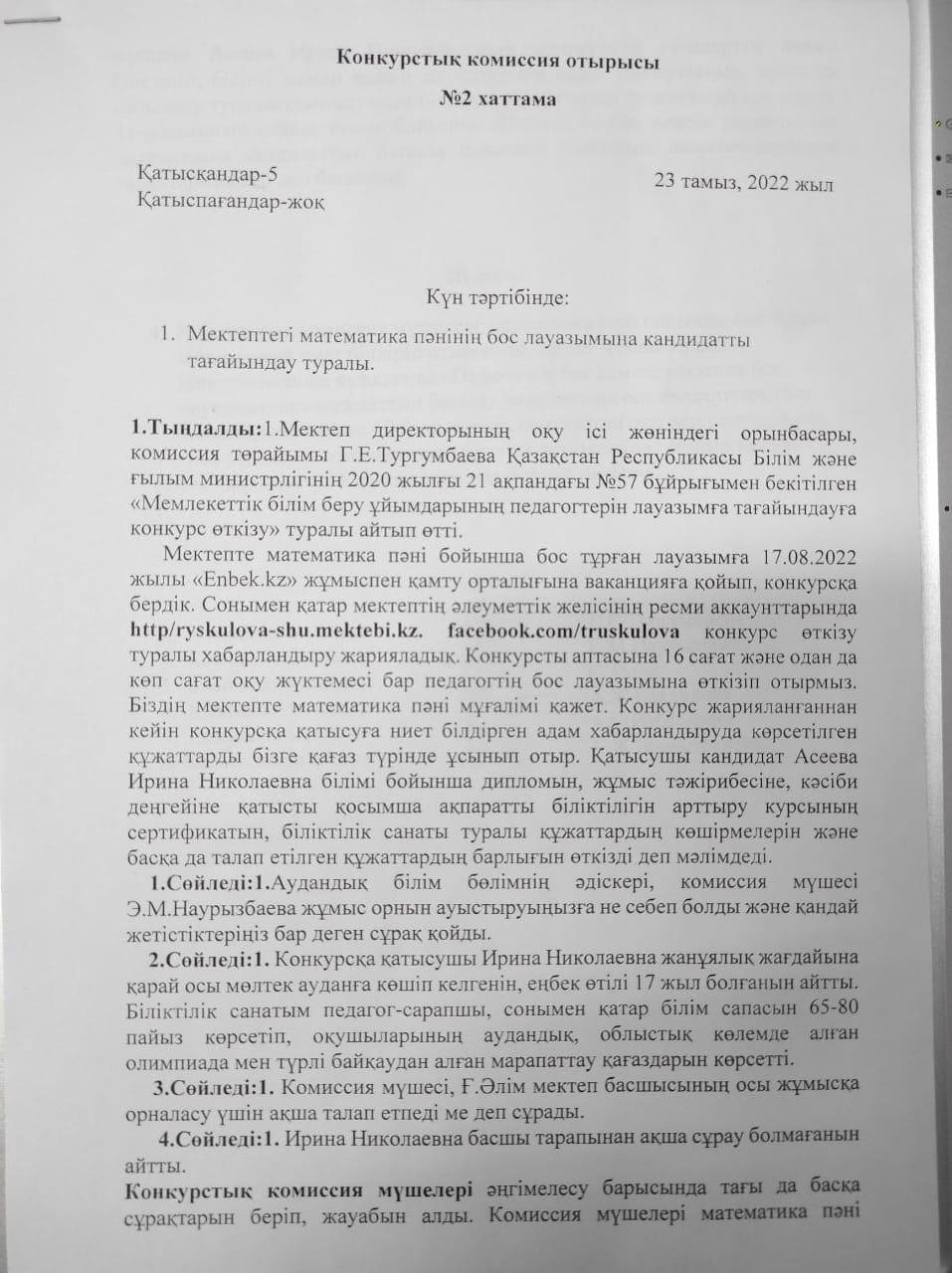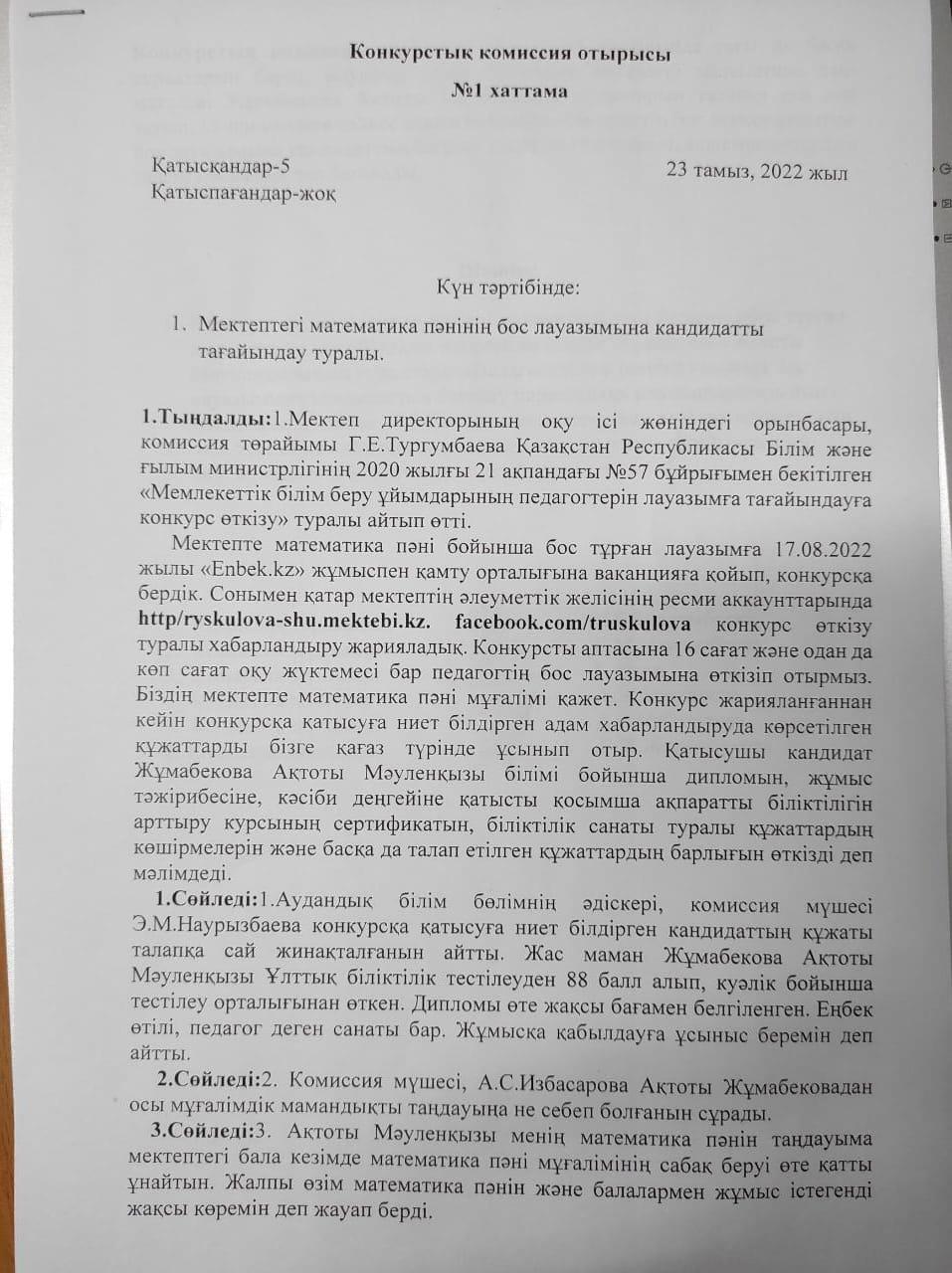 Шу қаласы "Тұрар Рысқұлов атындағы орта мектебі" КММ - інде педагогтерді бос лазуымға тағайындау конкурстық коммисия отырысы 2022 жылдың 23 тамызында өтті.