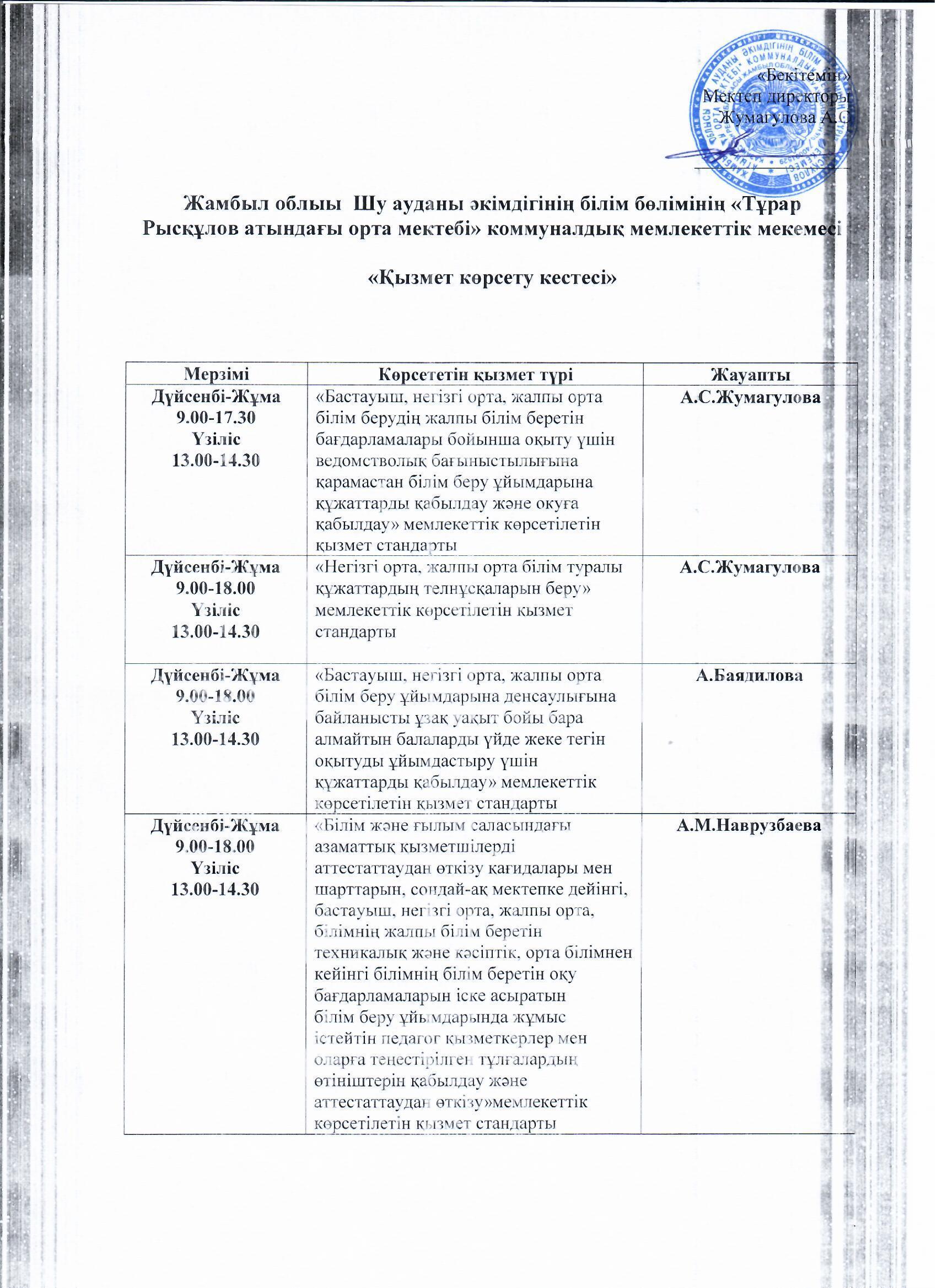 МЕМЛЕКЕТТІ ҚЫЗМЕТ КӨРСЕТУ СТАНДАРТТАРЫ » Тұрара Рысқұлов атындағы орта мектеп