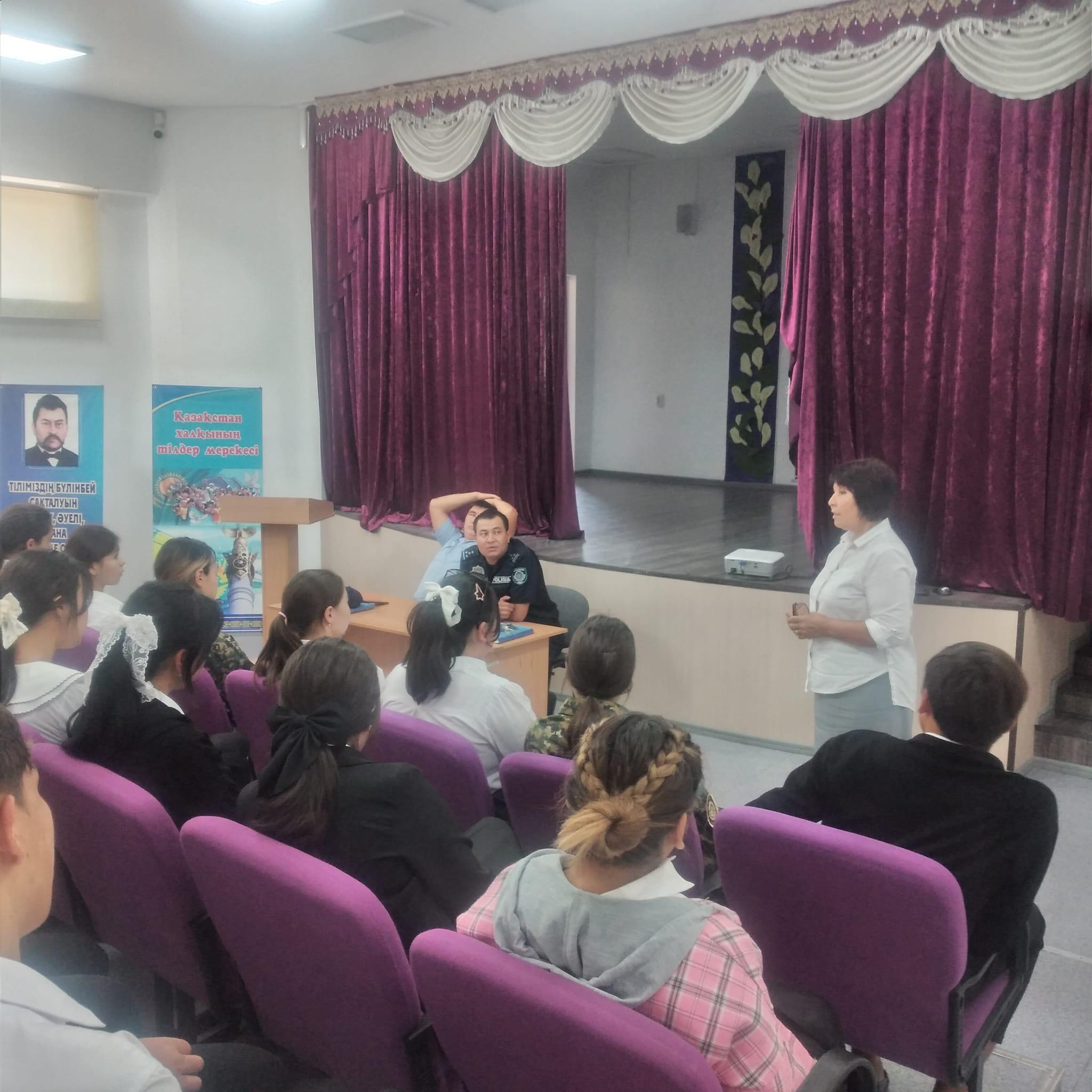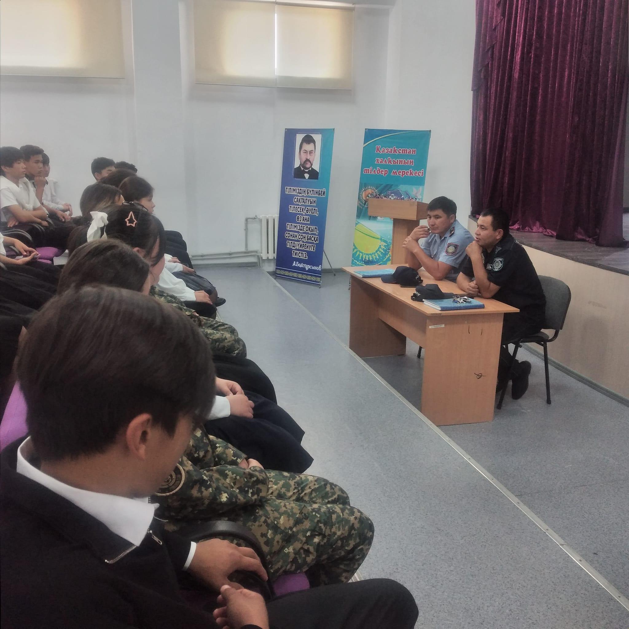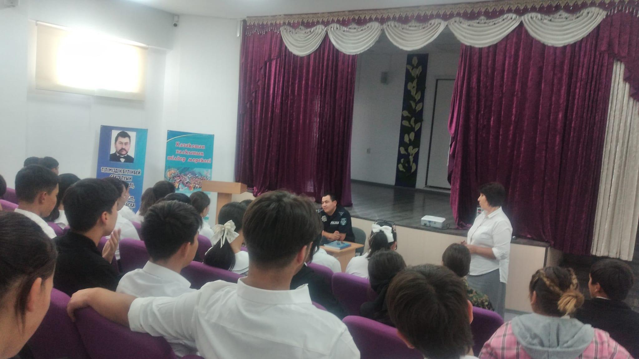 Тұрар Рысқұлов атындағы орта мектебінде мектеп инспекторы тәрбие орталығымен бірлесіп 10-11 сынып білім алушыларымен "Қауіпсіздік шаралары " тақырыбында жиналыс өткізді.