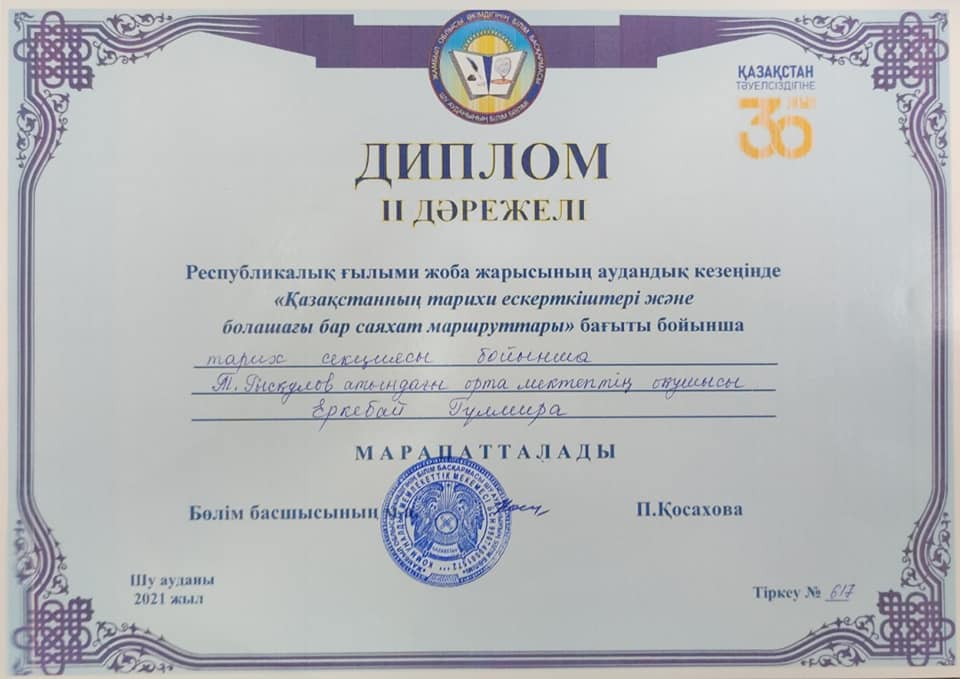 ."Қазақстанның тарихи ескерткіштері және болашағы бар саяхат маршруттары" бағытындағы әдебиет, экономикалық және әлеуметтік процестерді математикалық модельдеу бағыты бойынша информатика секциясы бойынша ІІ-ІІІ-дәрежелі дипломмен марапатталды.
