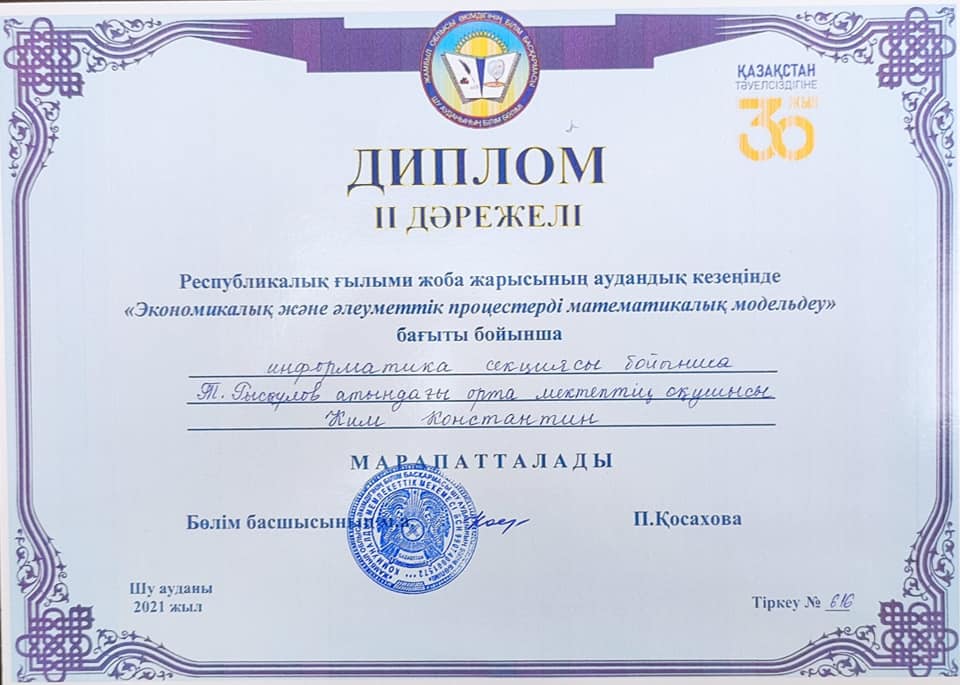 2.Экономикалық және әлеуметтік процестерді математикалық модельдеу бағыты бойынша информатика секциясы бойынша Ким Константин ІІ - дәрежелі дипломмен марапатталды. Жетекшісі - Баялбекова Сәуле.