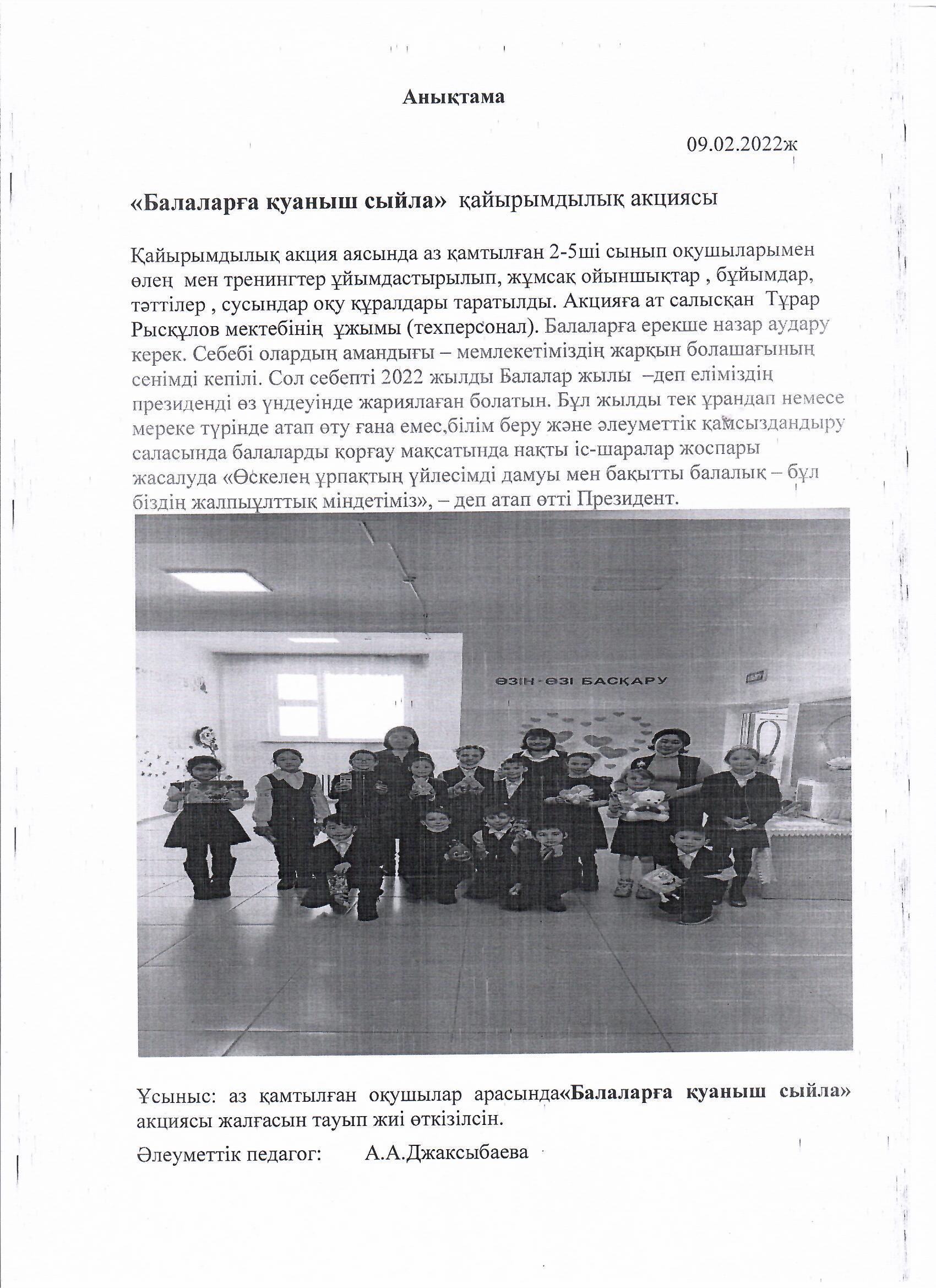 "Балаларға қуаныш сыйла" қайырымдылық акциясы » Тұрара Рысқұлов атындағы орта мектеп