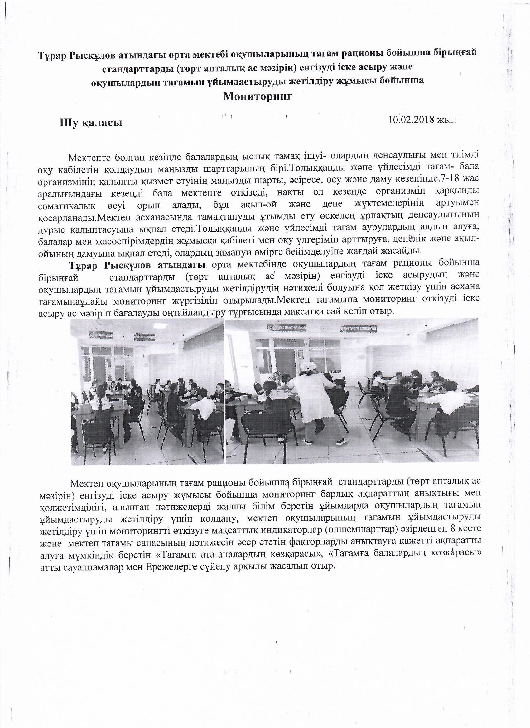 Оқушылардың тағам рационы бойынша біріңғай стандарттарды (төрт апталық ас мәзірін) енгізуді іске асыру және оқушылардың тағамын ұйымдастыруды жұмысы бойынша Мониторинг » Тұрара Рысқұлов атындағы орта мектеп