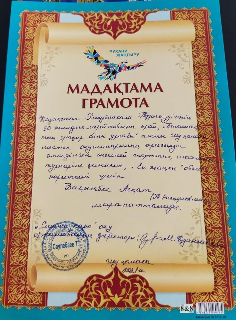 Қазақстан Республикасының Тәуелсіздігінің 30 жылдық мерей тойына орай Шу қалалық мектептер арасында "Болашақтың ұшқыр ойлы ұрпағы" атты шахмат турнирінде Тұрар Рысқұлов атындағы орта мектебінің оқушылары: Тұрысбек Әділ ІІІ - орын, Бақытбек Асқат "Ең жақсы" ойыншы мадақтау грамоталарымен марапатталды.