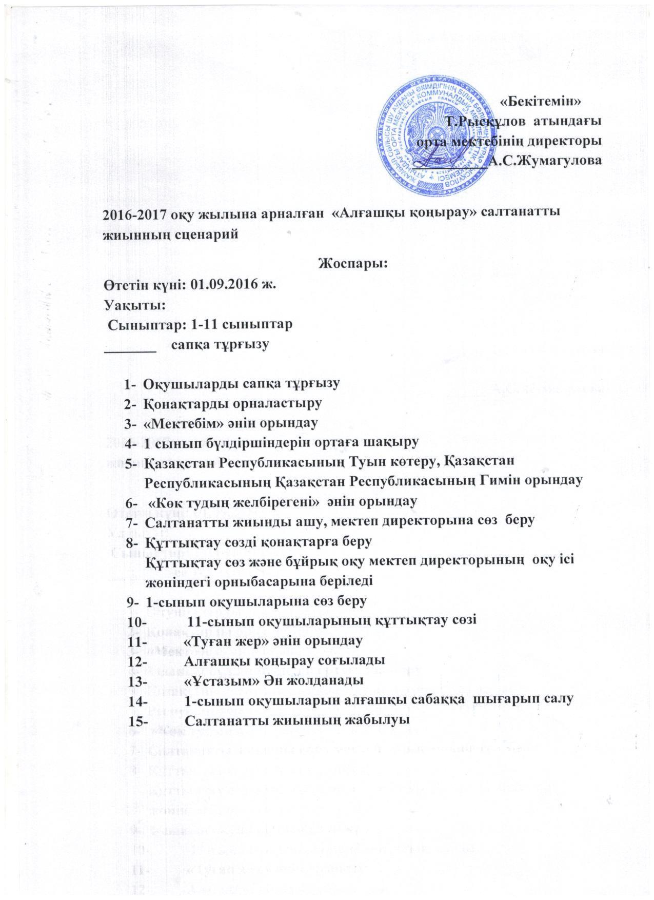 Мектепте Білім күніне арналған салтанатты жинының іс-шара жоспары құрылып бекітіліп, дайындық жұмыстарын жүргізілді.