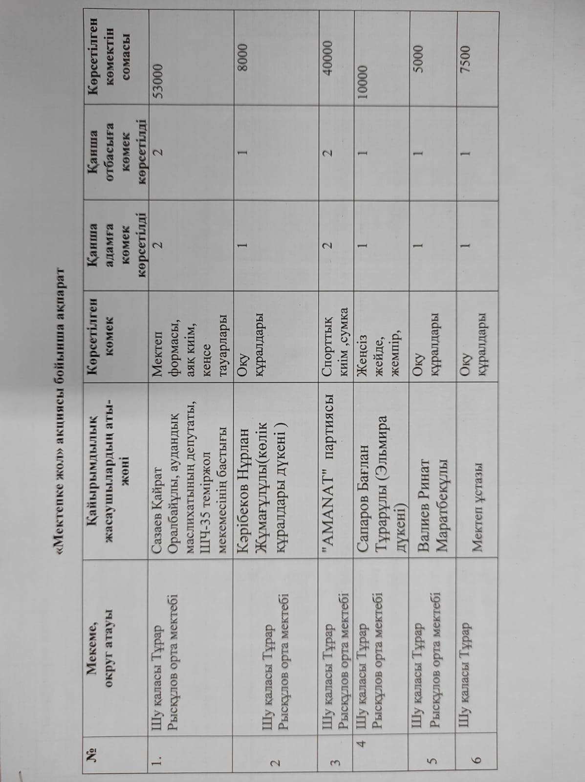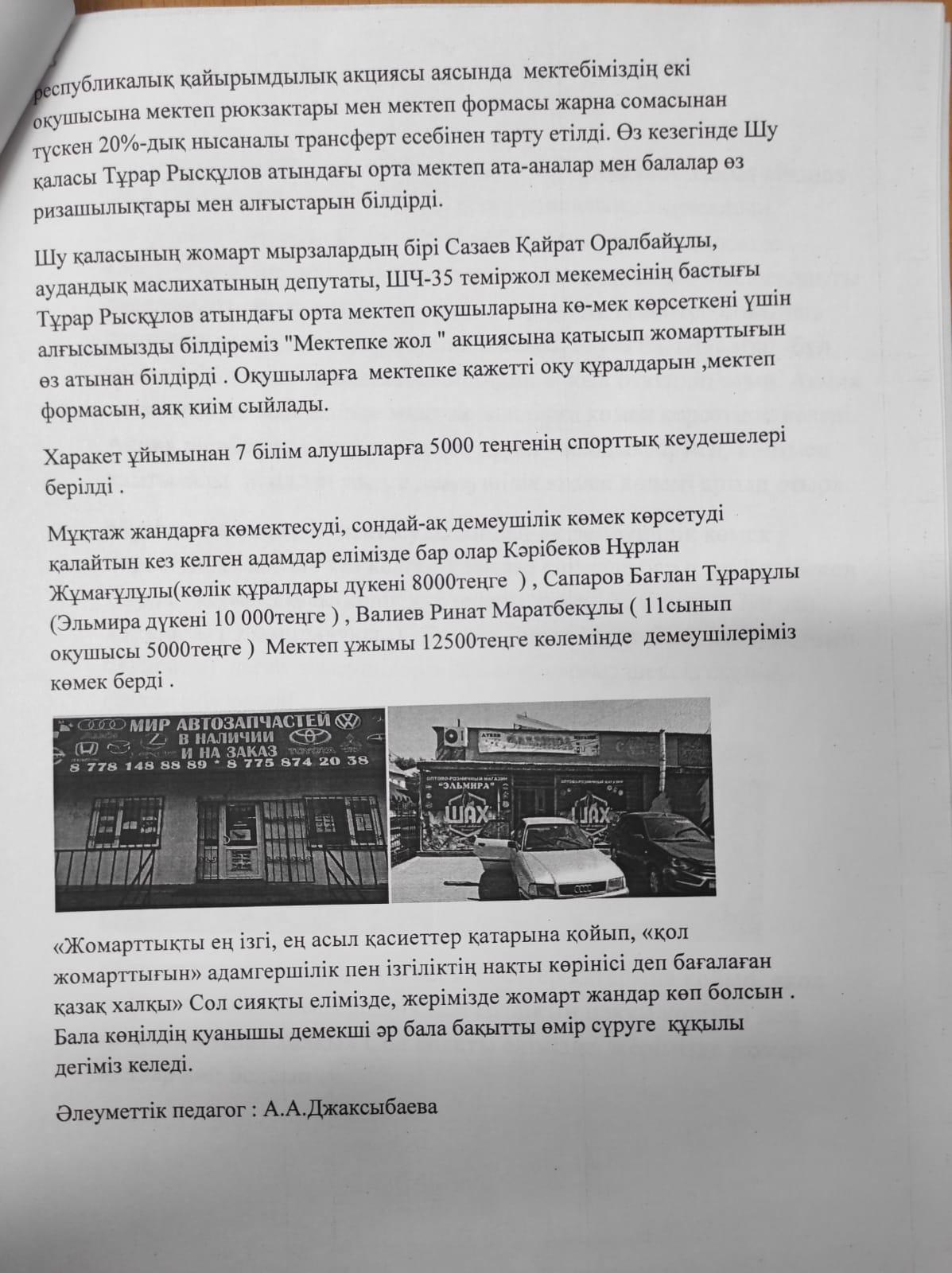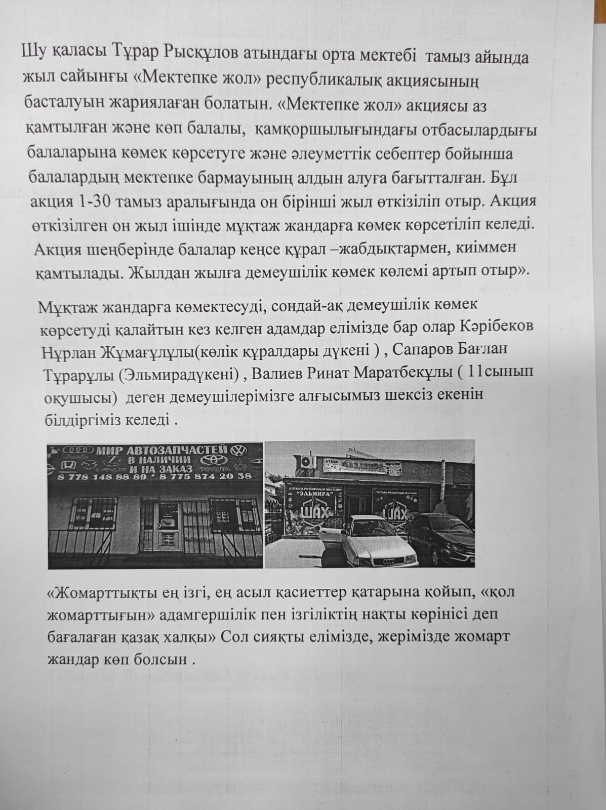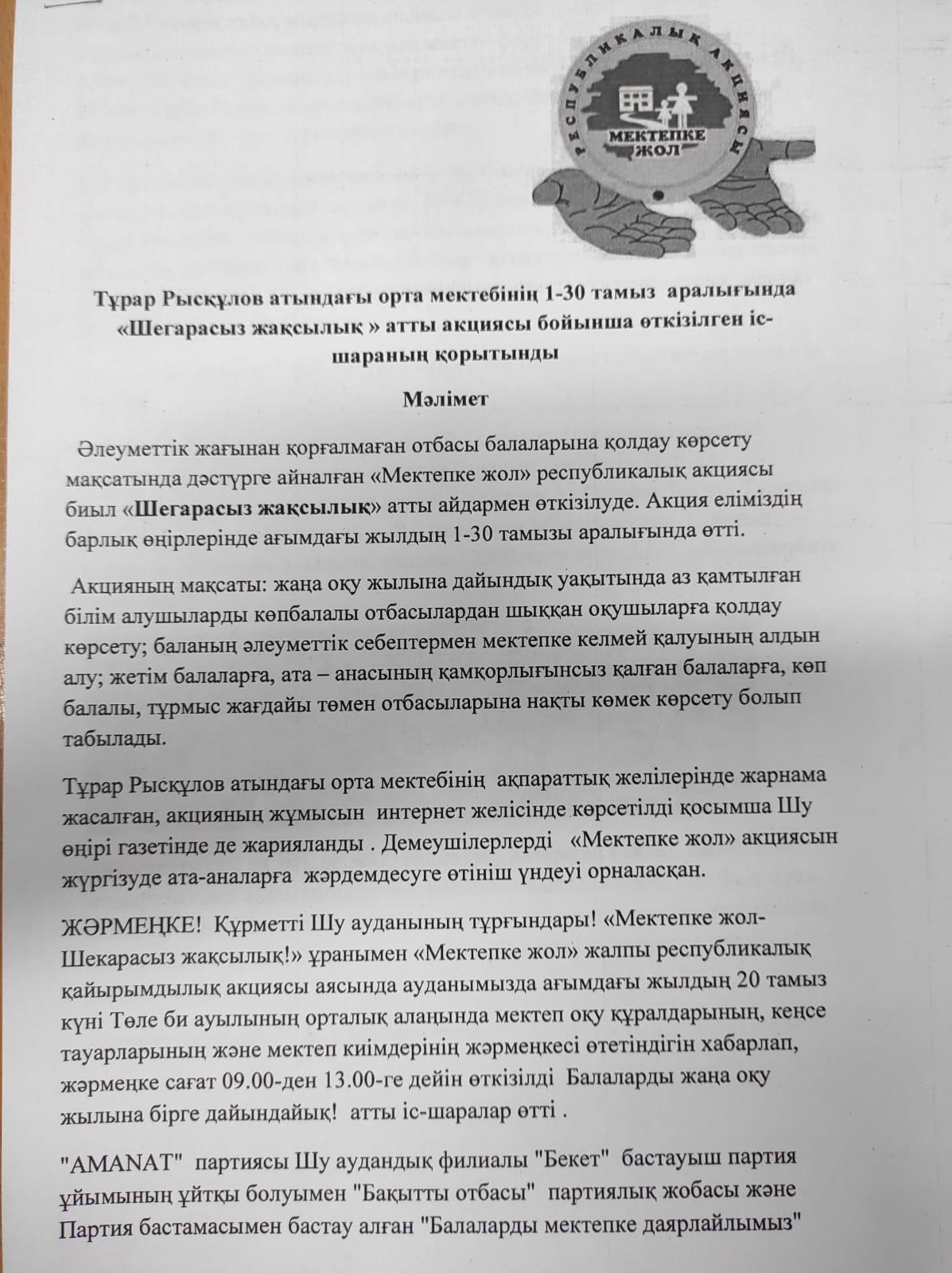 "Мектепке жол" акциясы бойынша ақпарат » Тұрара Рысқұлов атындағы орта мектеп